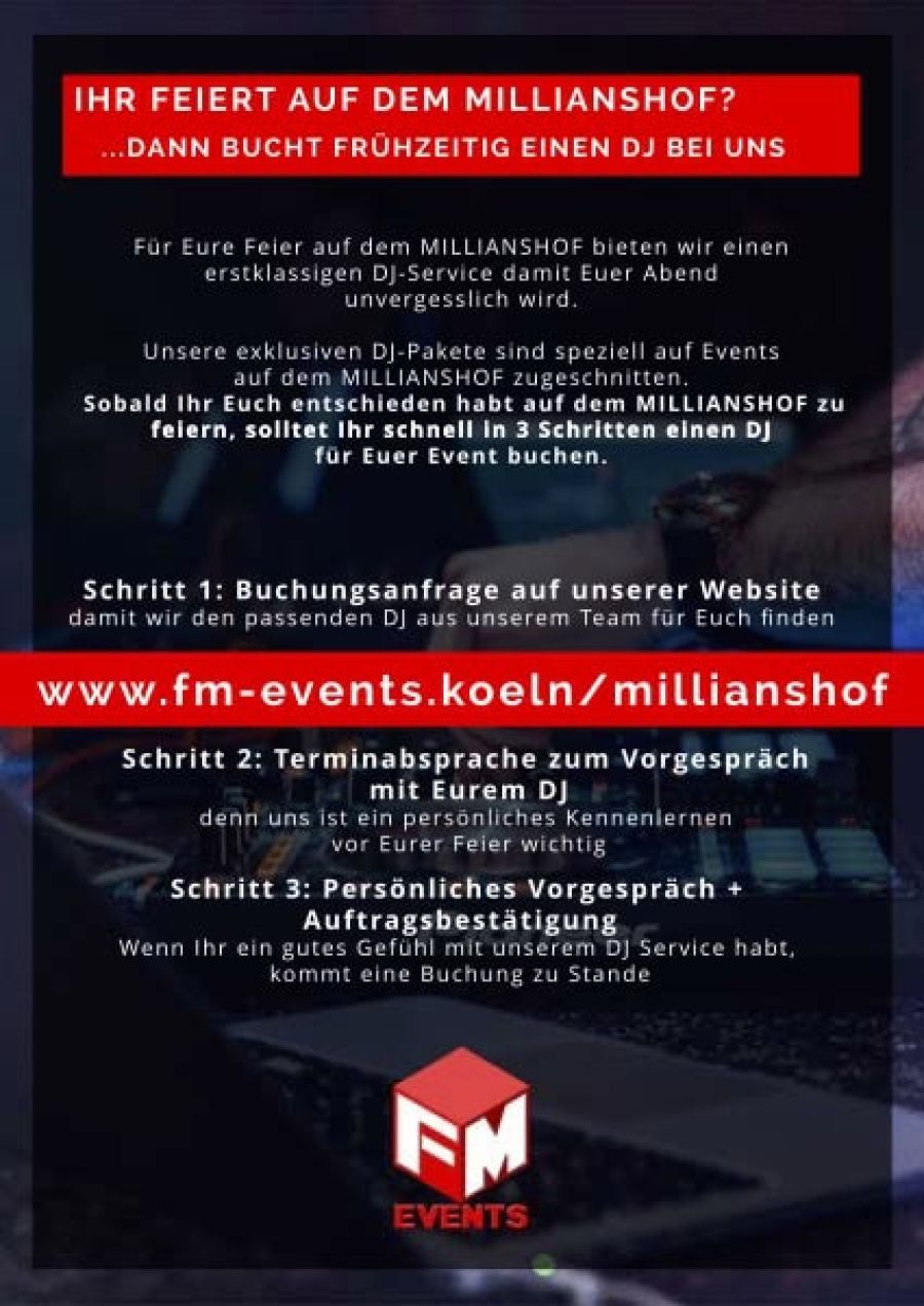 Buchen Sie jetzt Ihren DJ-Service mit FM Events und erleben Sie, wie Ihr Fest auf dem Millianshof zu einem einzigartigen Highlight wird!